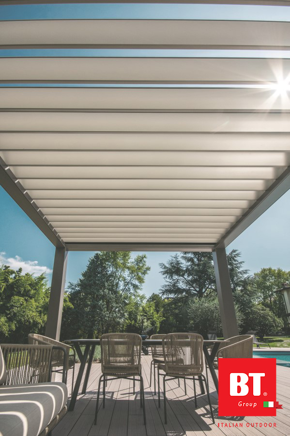 Grazie all’appoggio sulla parete, la pergola bioclimatica addossata offre anche un utilizzo più efficiente dello spazio, consentendo di sfruttare al meglio l’area esterna.